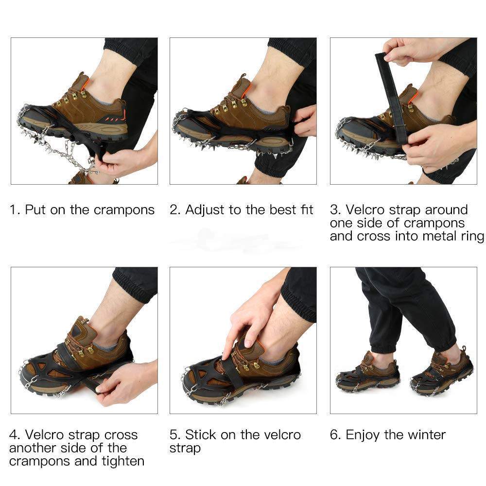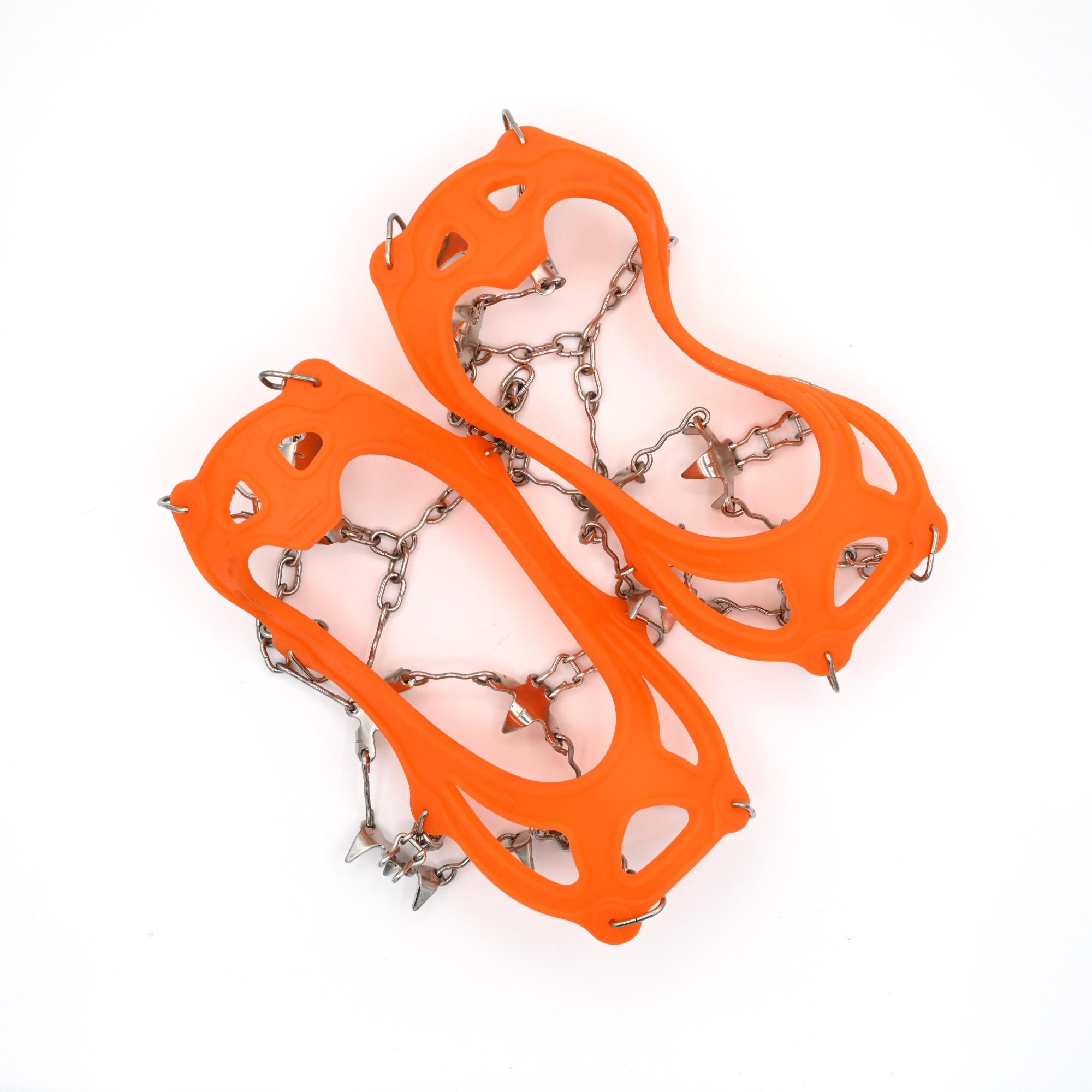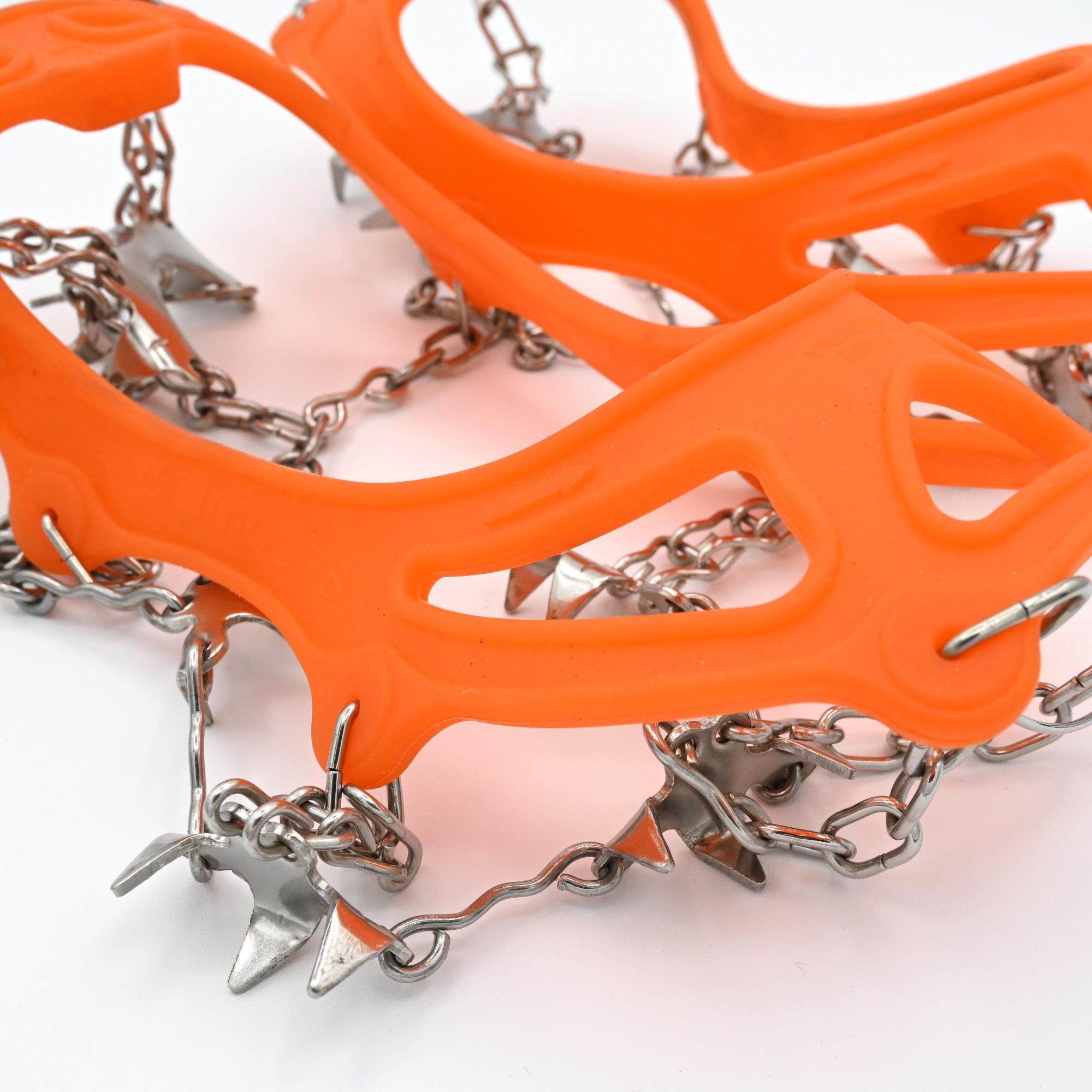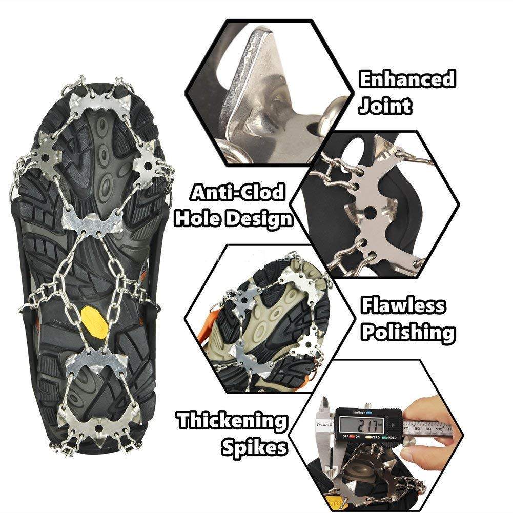 The traction cleats for shoes feature 18 stainless steel spikes.