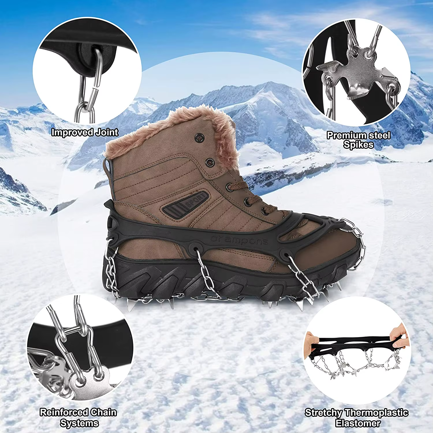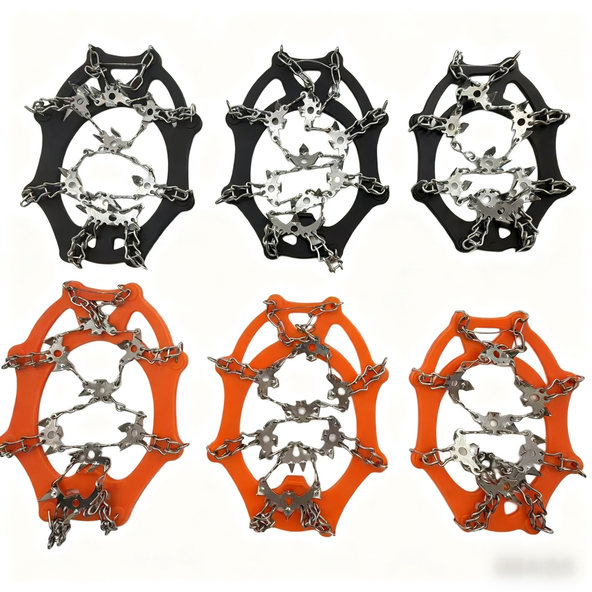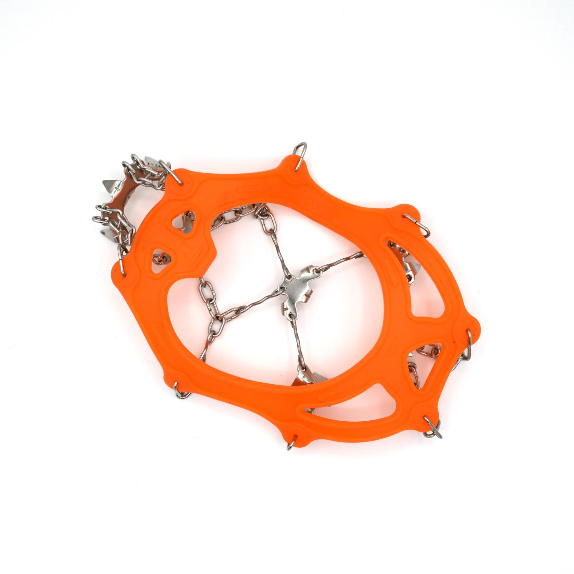 The traction cleats for shoes feature 18 stainless steel spikes.